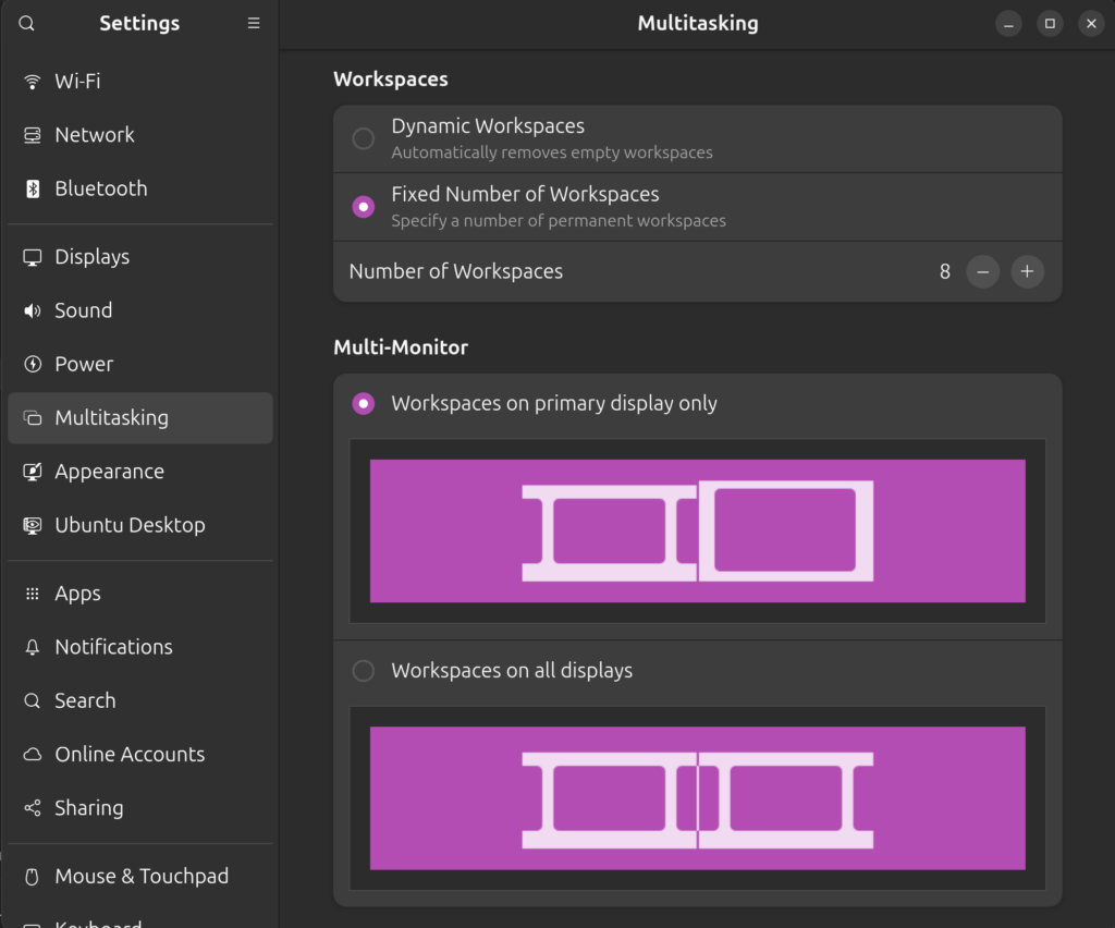 If you don’t, you’ll need to change your default server to X11 first. You’ll also need to install dconf through your package manager. Lastly, you’ll need to turn on workspaces and decide on the number (I’m using 8):