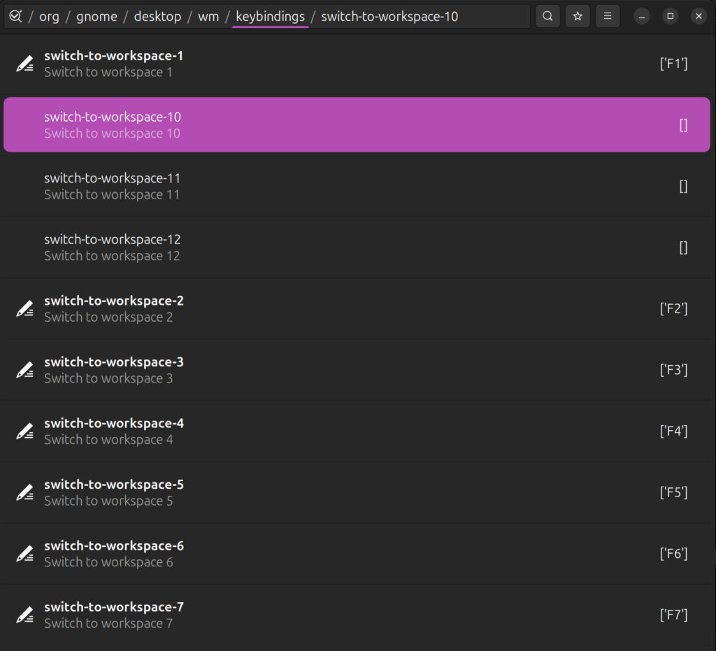 Getting the single key navigation working for 8 workspaces is a little tricky. If you’re only going to use 4 workspaces, you can skip dconf and just change the keyboard shortcuts in Settings > Keyboard > Shortcuts > Navigation. If you’re going to use more, dconf is necessary. Be careful not to change anything in dconf unless you know what it does. Making a mistake here could make your system very difficult or impossible to navigate.