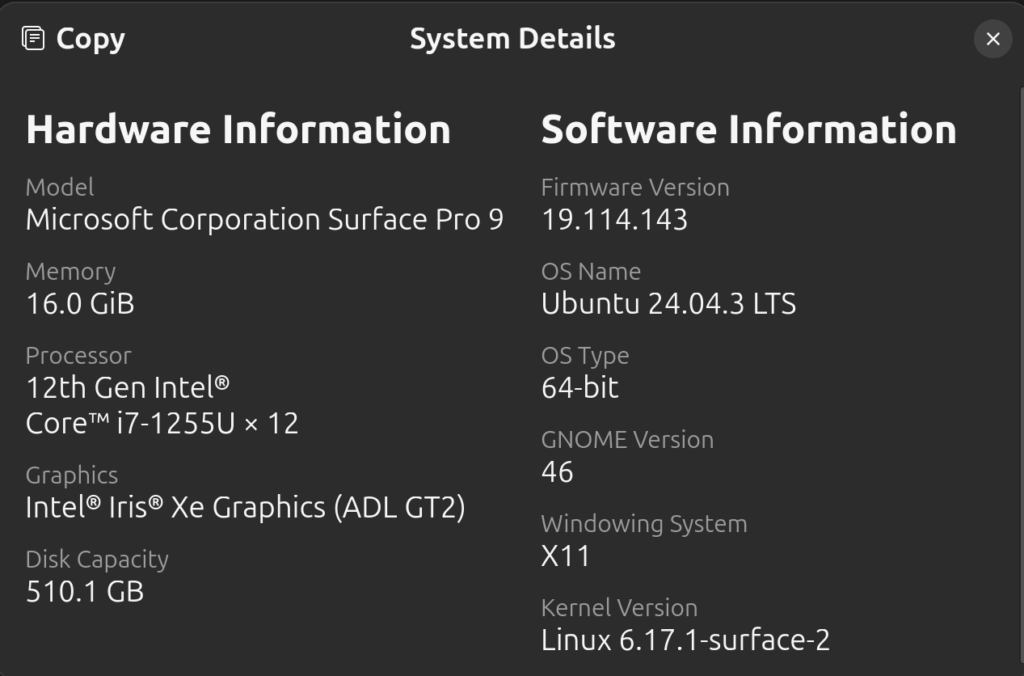 If you’re following exactly my setup, you’ll need to make sure of a few things. First, make sure you’re using X11. Go to settings > system > system details and make sure you see X11 under windowing system: